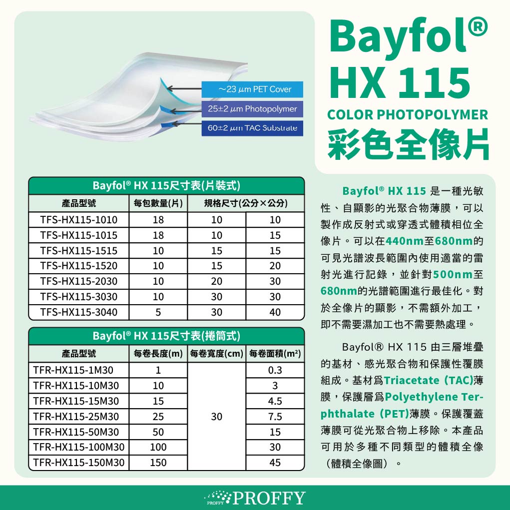 ㅤㅤBayfol HX115彩色全像片,分為片裝式和捲筒式兩種,並且可以裁切為您需要的大小,請參考此商品型號規格。