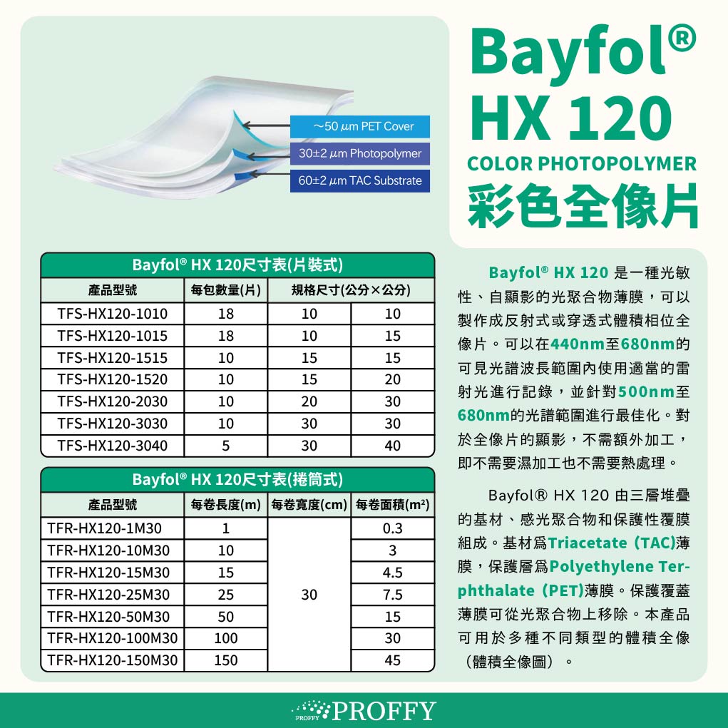 ㅤㅤBayfol HX120彩色全像片,分為片裝式和捲筒式兩種,並且可以裁切為您需要的大小,請參考此商品型號規格。